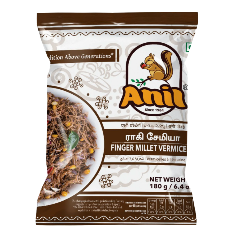 ANIL VERMICELLI 180G – RAGI (FINGER MILLET) is made from nutrient-rich ragi, also known as finger millet, a traditional grain valued for its high fiber and calcium content. This millet-based vermicelli is a healthy alternative to regular varieties, offering natural goodness in every serving.